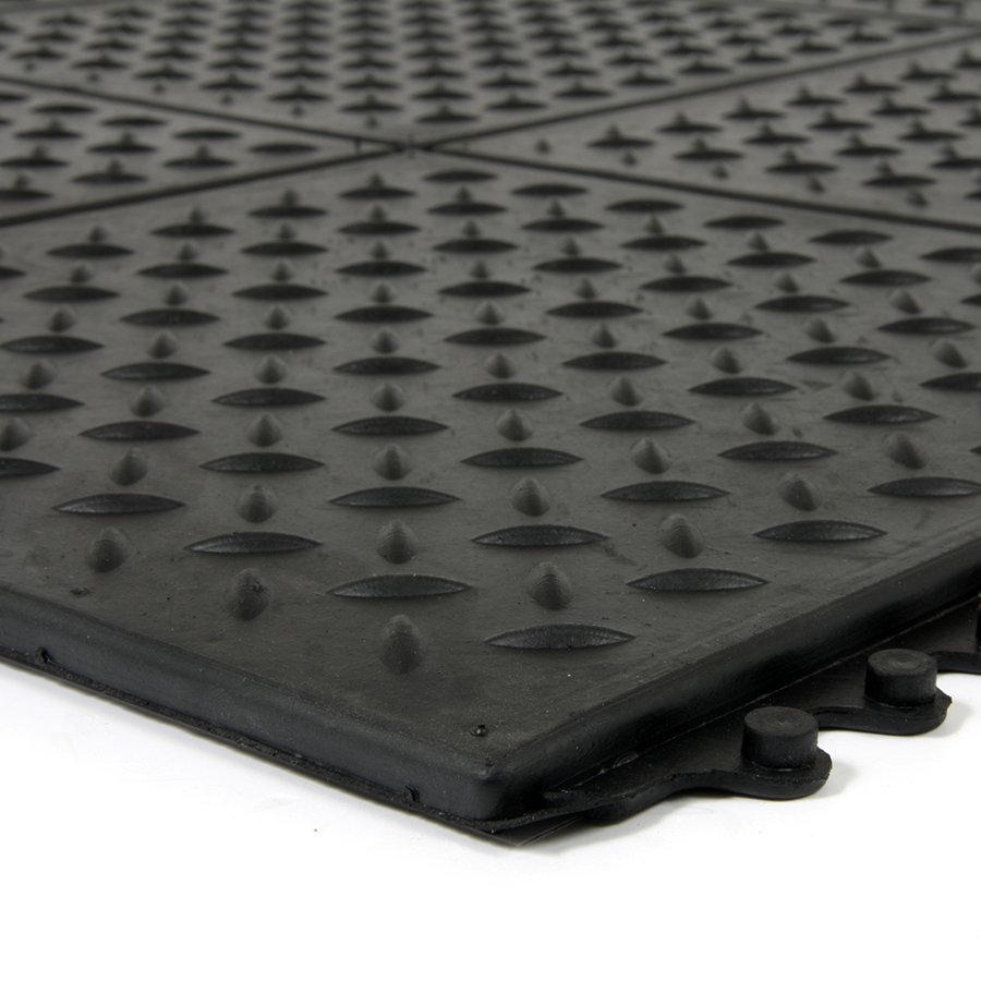 The modular rubber mat with a "boiler plate" surface texture is ideal for assembling a rubber floor of any size, suitable for a sports center, but also for a garage or home workshop, production. Thanks to its surface, it has excellent anti-slip properties, absorbs shocks caused by the impact of objects or shoes and reduces noise, has an anti-fatigue effect, insulates from the cold floor. Using the connection of individual modules, you can create a rubber floor of any size. You can finish the floor by cutting off the locks - males. If necessary, the individual modules can be easily divided and relocated (watch out for modules with cut locks, they can no longer be connected, they will always be marginal modules).