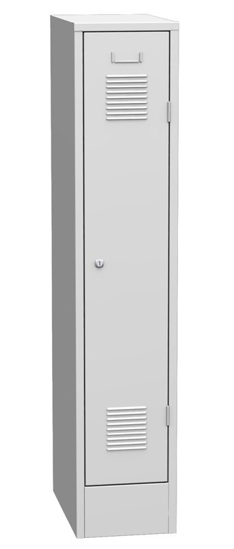 One-door metal wardrobe on plinth, width 300, height 1850, depth 500 mm. The doors are equipped as standard with a reinforcement for increased resistance, ventilation louvres for effective ventilation and a molding with a paper nameplate. The doors are hung on external hinges, at the customer's request it is also possible to hang them on internal hinges. For an additional fee, it is possible to equip the door with other types of ventilation holes for a more attractive appearance. To increase safety, extend the reinforcement over the entire length of the door, or replace the door with a double-skinned one. Body color RAL 7035 light gray.