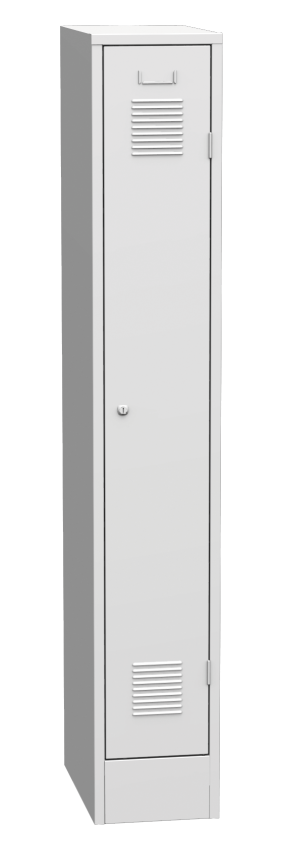 One-door metal wardrobe on a plinth, width 300, height 1850, depth 500 mm, internal partition for separating clean and dirty clothes. The doors are equipped as standard with a reinforcement for increased resistance, ventilation louvres for effective ventilation and a molding with a paper nameplate. The doors are hung on external hinges, at the customer's request it is also possible to hang them on internal hinges. For an additional fee, it is possible to equip the door with other types of ventilation holes for a more attractive appearance. To increase safety, extend the reinforcement over the entire length of the door, or replace the door with a double-skinned one. Body color RAL 7035 light gray.