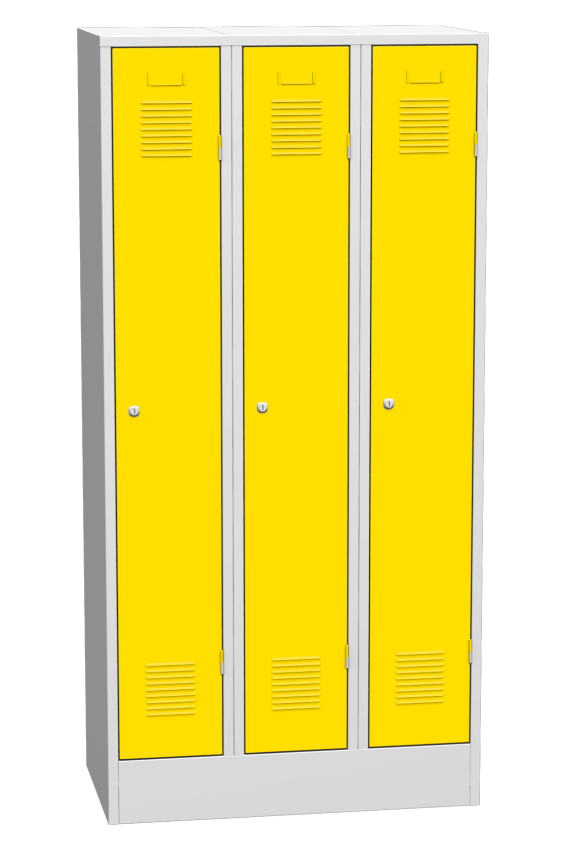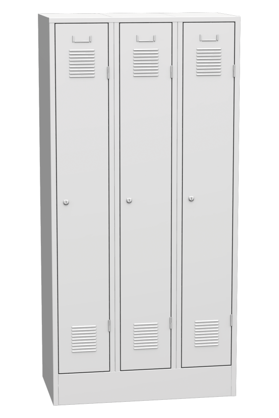 Three-door metal wardrobe on a plinth, width 900, height 1850, depth 500 mm, internal partition for separating clean and dirty clothes. The doors are equipped as standard with a reinforcement for increased resistance, ventilation louvres for effective ventilation and a molding with a paper nameplate. The doors are hung on external hinges, at the customer's request it is also possible to hang them on internal hinges. For an additional fee, it is possible to equip the door with other types of ventilation holes for a more attractive appearance. To increase safety, extend the reinforcement over the entire length of the door, or replace the door with a double-skinned one. Body color RAL 7035 light gray.