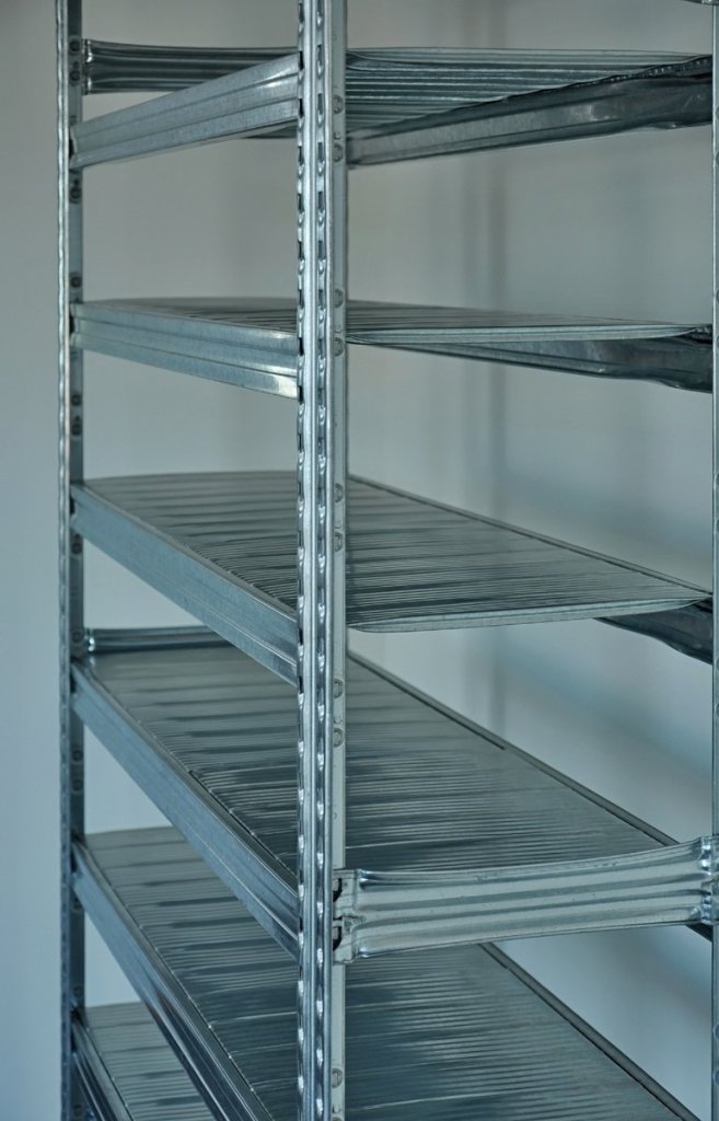 Screwless shelf rack. 10x shelves, load capacity 125 kg. Dimensions h. 1972 x w. 1124 x d. 330 mm.