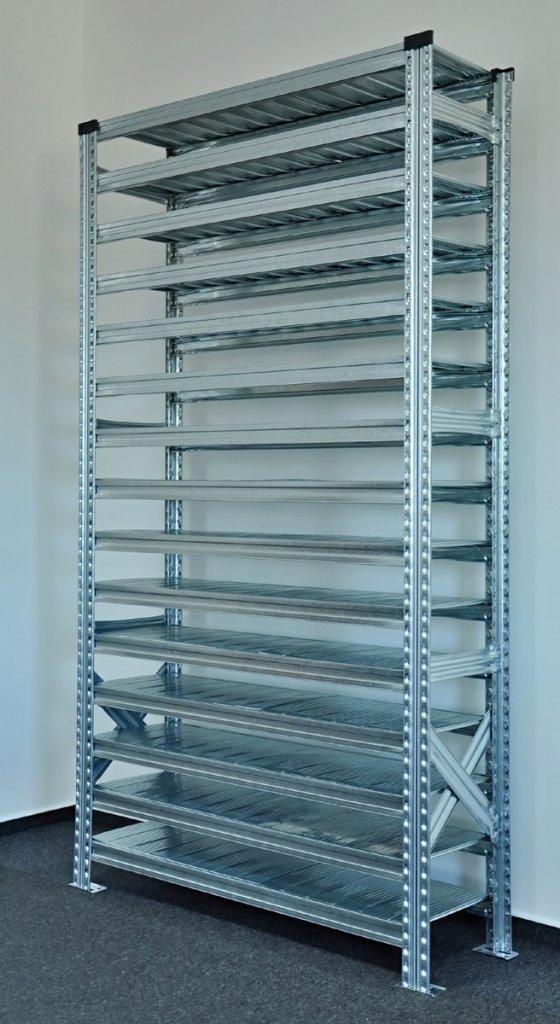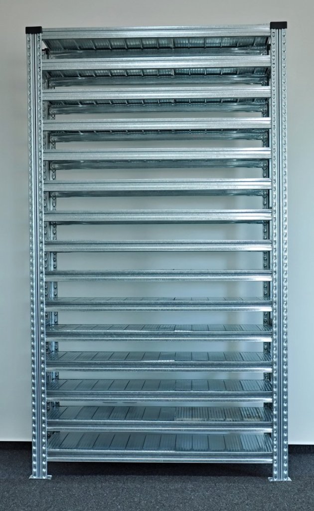 Screwless shelf rack. 15 shelves, load capacity 125 kg. Dimensions h. 1972 x w. 1124 x d. 330 mm.