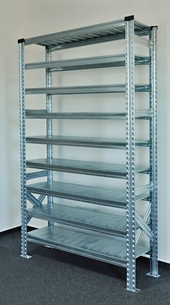 Screwless shelf rack. 9 shelves, load capacity 125 kg. Dimensions h. 1972 x w. 1124 x d. 410 mm. full description and parameters