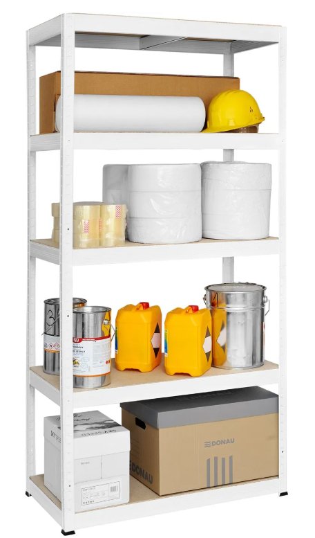 Universal shelf rack, screwless mounting system. Rack height 1800 x width 900 x depth 450 mm, 5 shelves with reinforcement, load capacity 200 kg. Version in white.