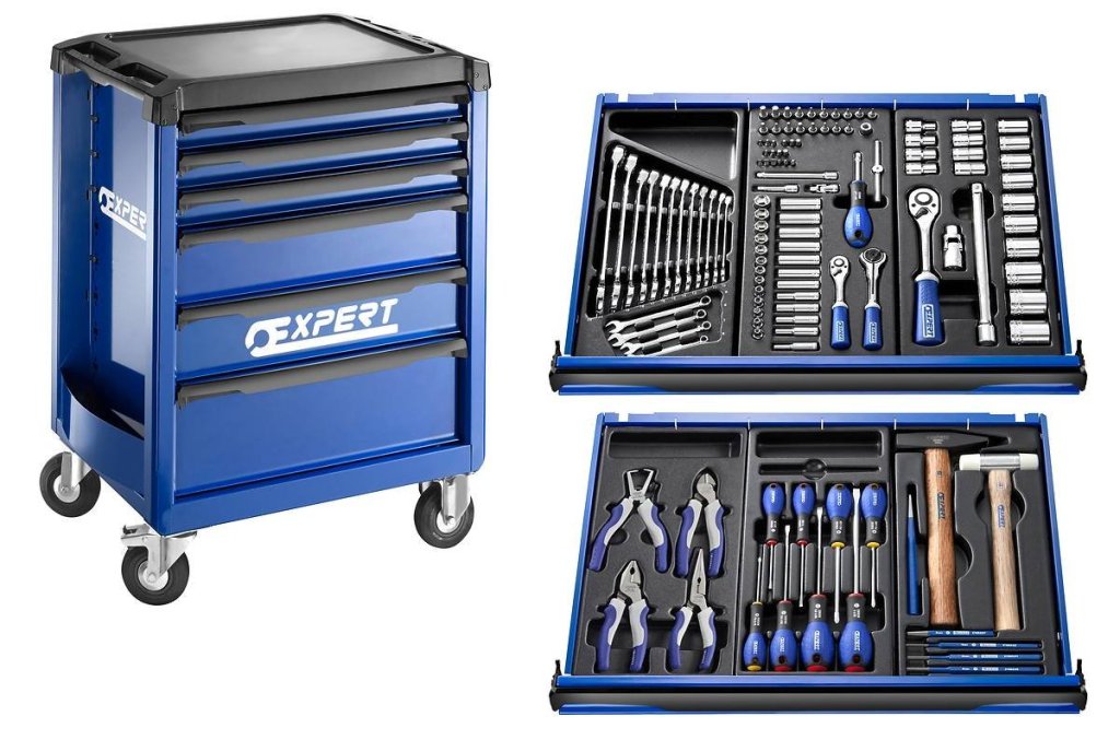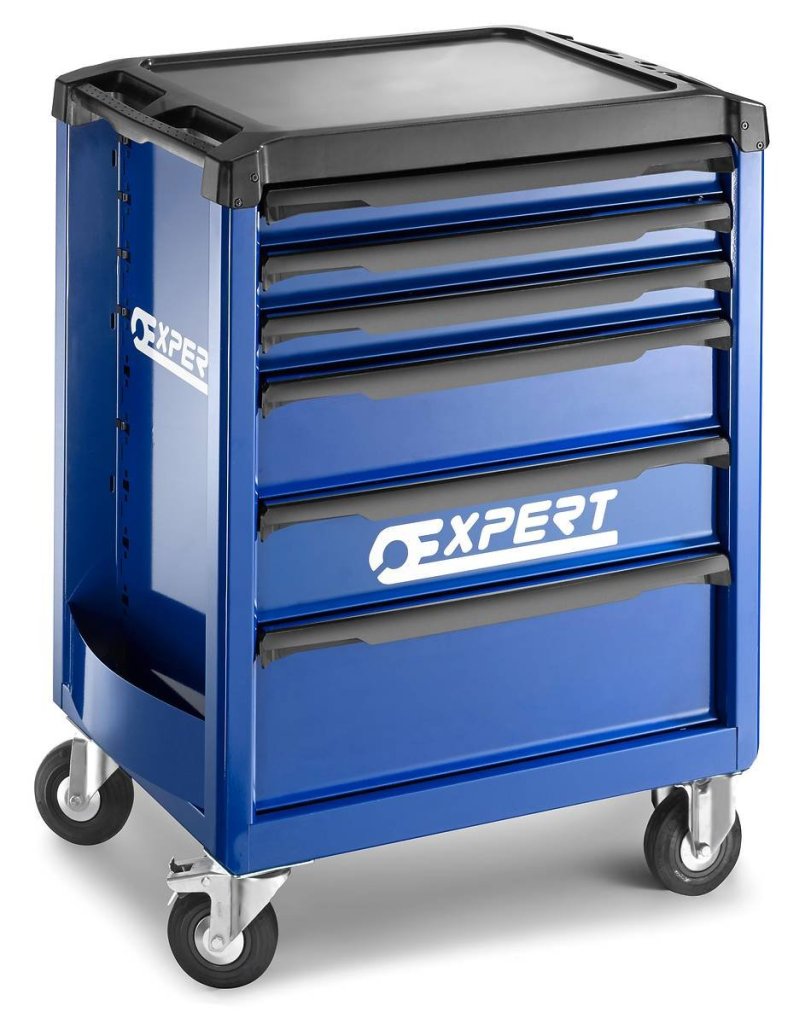 6-drawer workshop service trolley. Height 970 x width 748 x depth 515 mm. 3 x 60 mm socket, 2 x 130 mm socket and 1 x 200 mm socket. 2 swivel and 2 fixed wheels, handle. Color blue/anthracite.
