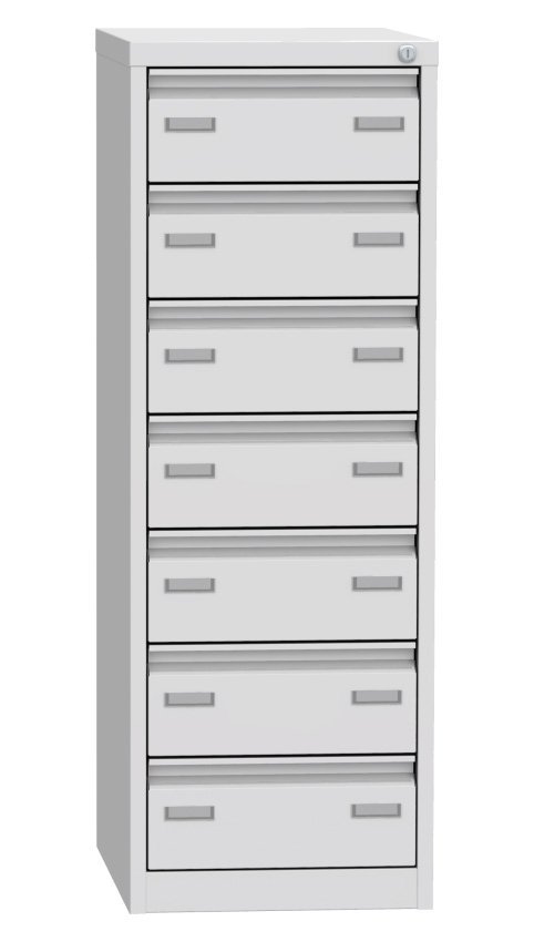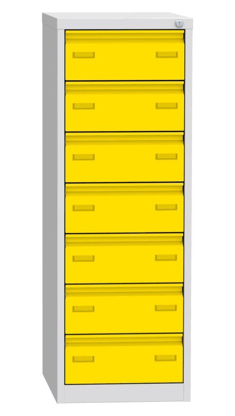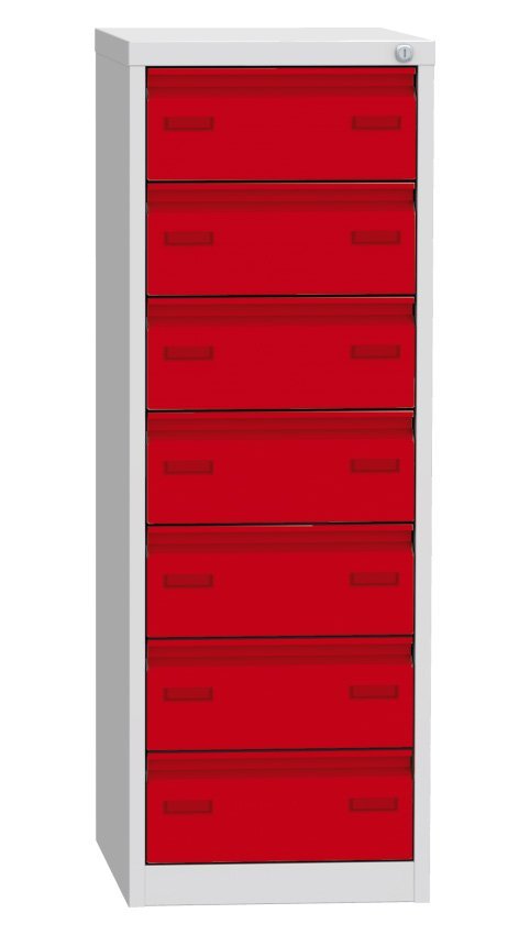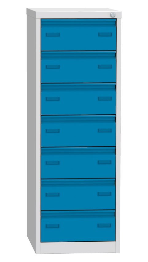 Postcard box for A6 formats with seven drawers (there are 2 compartments in each drawer). Height 1250 x width 440 x depth 600 mm. Metal body in light gray RAL 7035, drawers in different colors, central lock.