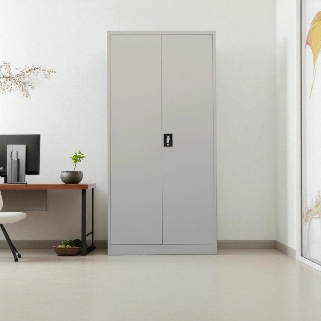 Two-door metal filing cabinet, 2x shelves, height 1000, width 800, depth 383 mm, lockable. Color gray RAL 7035.