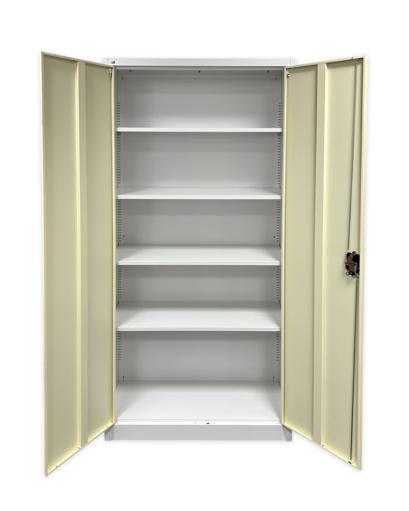 Two-door dismantled cabinet made of sheet steel 0.6 mm thick. Height 1950 x width 900 x depth 400 mm, 4 x shelves, cylinder lock full description and parameters