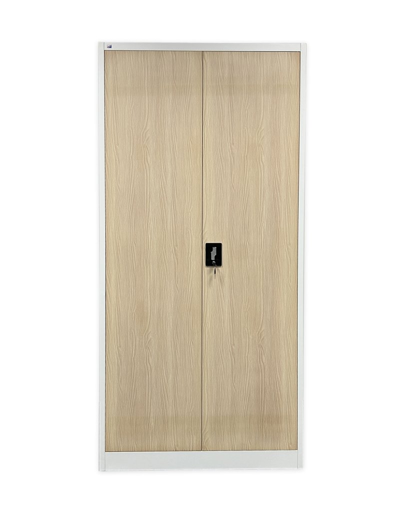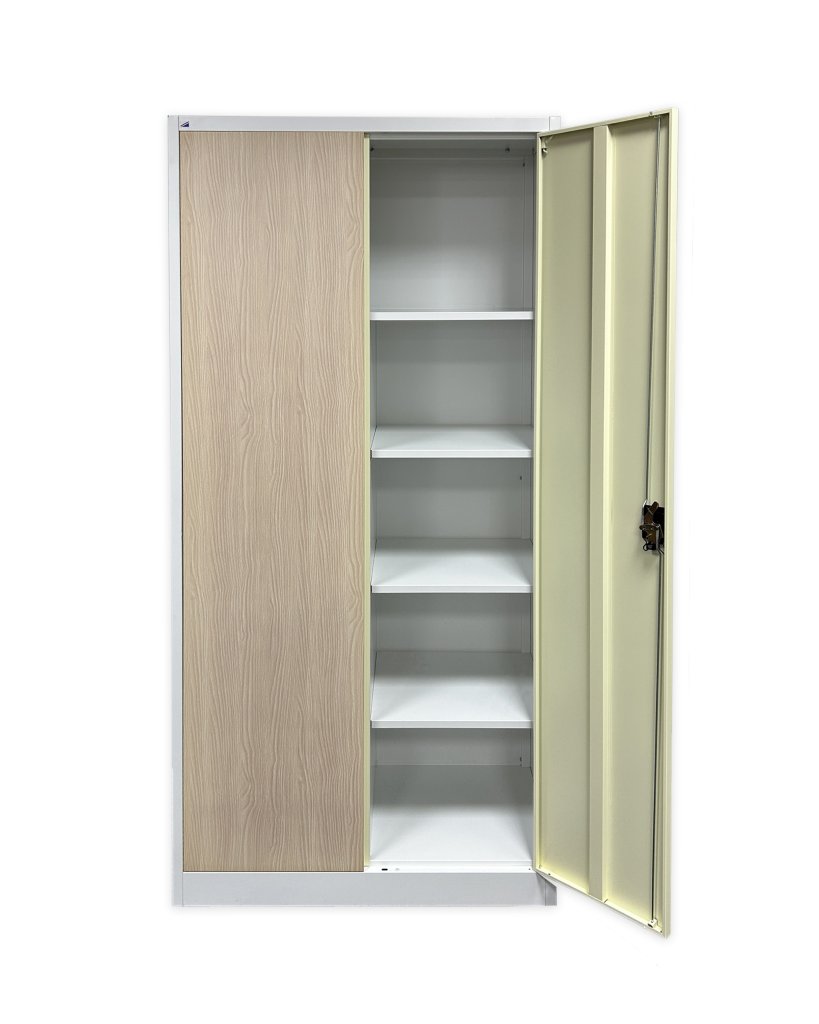 Two-door dismantled cabinet made of sheet steel 0.6 mm thick. Height 1950 x width 900 x depth 400 mm, 4 x shelves, cylinder lock with two keys. Surface treatment with powder paint.