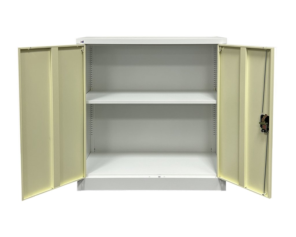 Two-door dismantled cabinet made of sheet steel 0.6 mm thick. Height 1000 x width 900 x depth 400 mm, 1x shelve, cylinder lock with two keys. Surface treatment with powder paint.