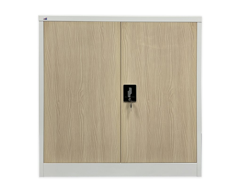 Two-door metal filing cabinet, 2x shelves, height 1000, width 800, depth 383 mm, lockable. Color gray RAL 7035.