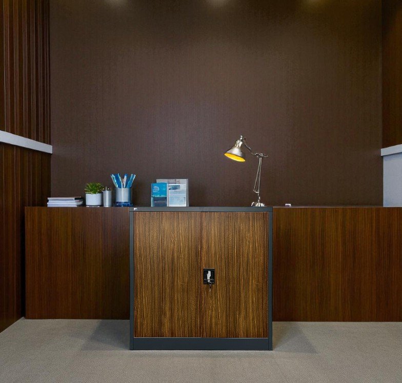 Two-door metal filing cabinet, 2x shelves, height 1000, width 800, depth 383 mm, lockable. Color gray RAL 7035.