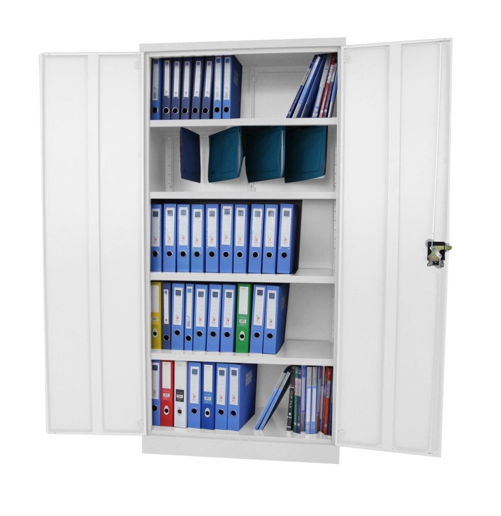 Two-door metal filing cabinet, 4 shelves, height 1800, width 800, depth 383 mm, lockable. Color gray RAL 7035.