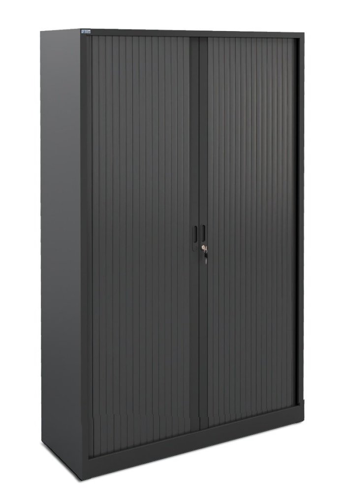 Metal cabinet with horizontal shutter with 2 shelves. Shelf capacity 50 kg. Color of body and blinds anthracite RAL 7016. Height 1050 x width 1200 x depth 450 mm.