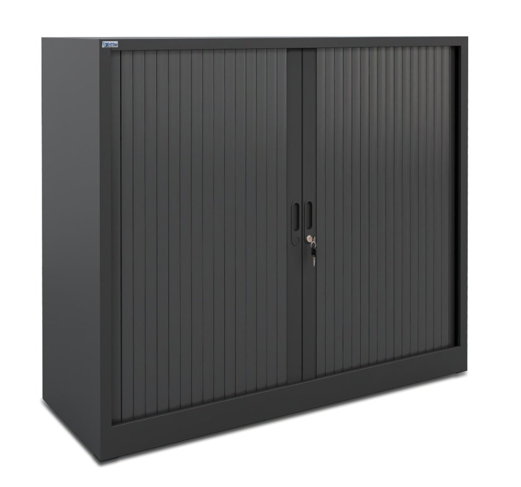 Metal cabinet with horizontal shutter with 2 shelves. Shelf capacity 50 kg. Color of body and blinds anthracite RAL 7016. Height 1050 x width 1000 x depth 450 mm.