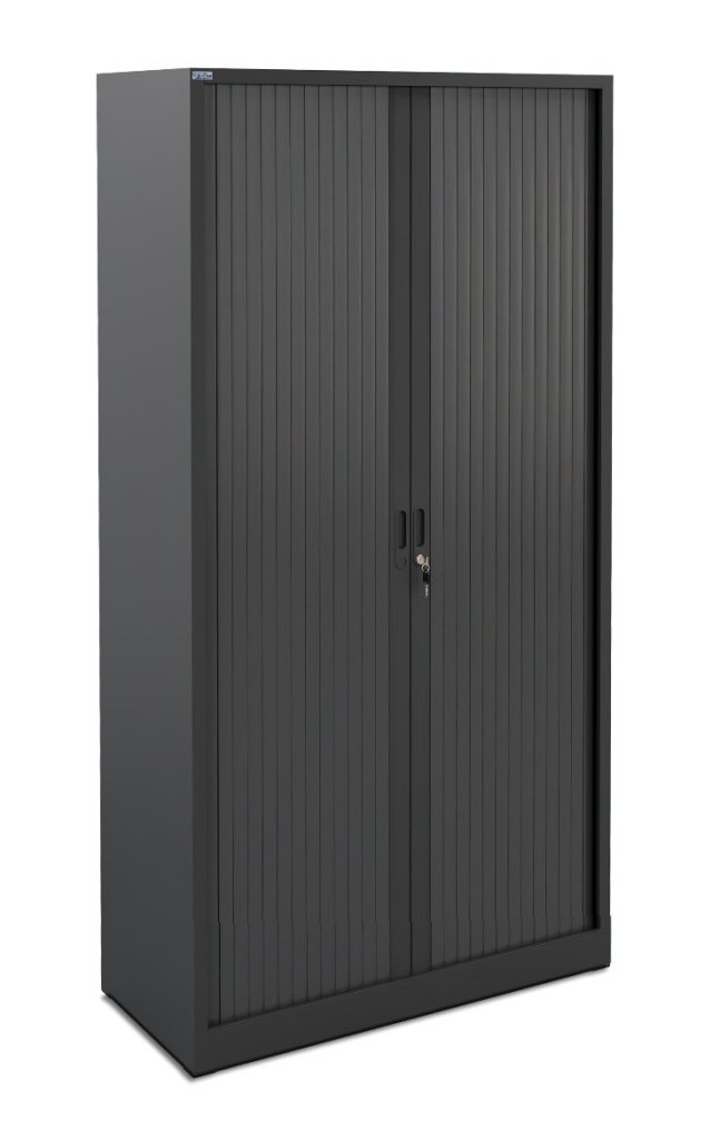 Metal cabinet with horizontal shutter with 4 shelves. Shelf capacity 50 kg. Color of body and blinds anthracite RAL 7016. Height 1950 x width 1000 x depth 450 mm.