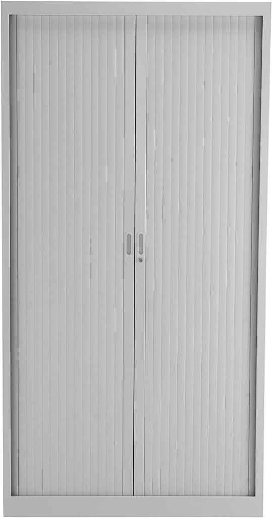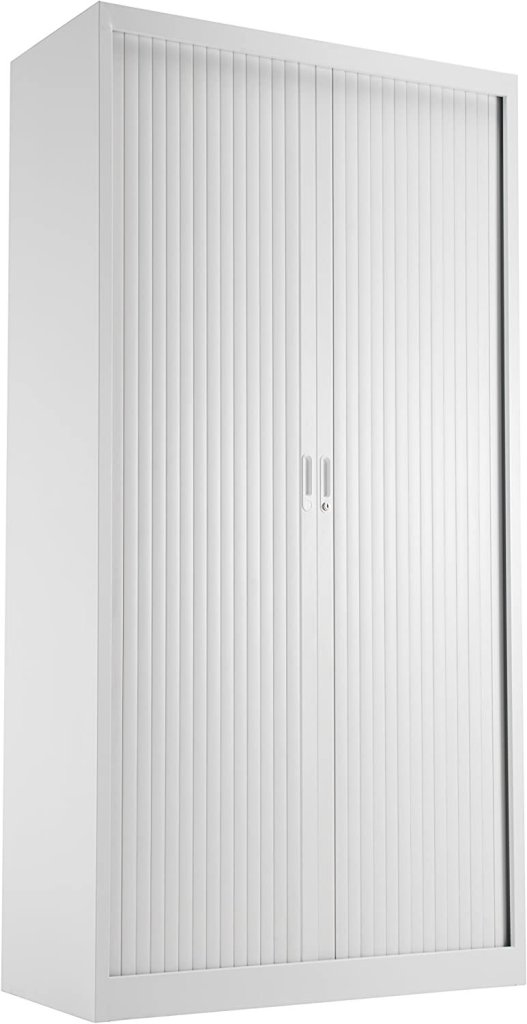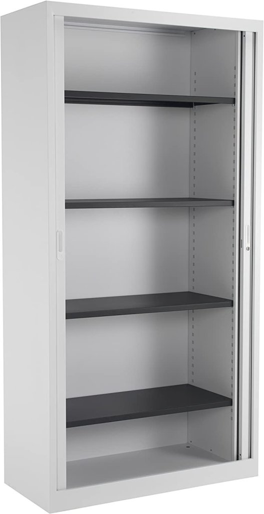 Metal cabinet with horizontal shutter with 4 shelves. Shelf capacity 40 kg. Various colors to choose from. Height 1990 x width 1000 x depth 435 mm.