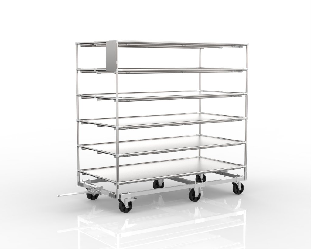 A shelf trolley made of steel chassis with a tubular system superstructure. The possibility of connecting more carts to the train. Suitable for transporting material and products.