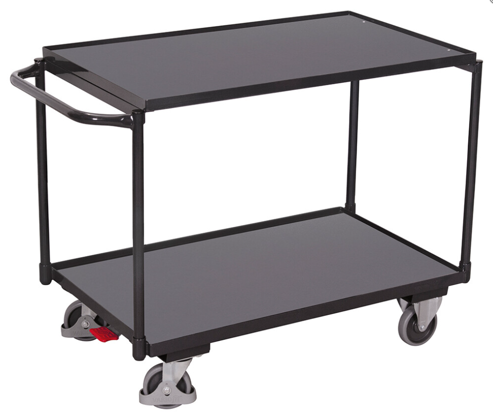 Steel construction, wooden loading surface - dark gray. Surface treatment with RAL 7016 anthracite powder coating, resistant to impacts and scratches. Highly durable thermoplastic castors with ball bearings, 2 swivel with central Easy Stop brake, 2 fixed. Dimensions height 850 x width 1025 x depth 525 mm. Edge height 12 mm. 2 shelves. Load capacity 250 kg.