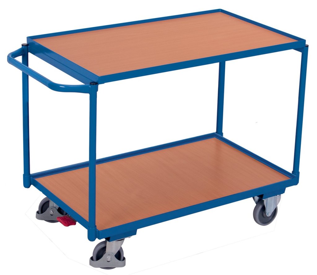 Steel construction, wooden loading surface - beech. Surface treatment with RAL 5010 blue powder coating, resistant to impacts and scratches. Highly durable thermoplastic castors with ball bearings, 2 swivel with central Easy Stop brake, 2 fixed. Dimensions height 1010 x width 975 x depth 525 mm. Edge height 12 mm. 2 shelves. Load capacity 250 kg.