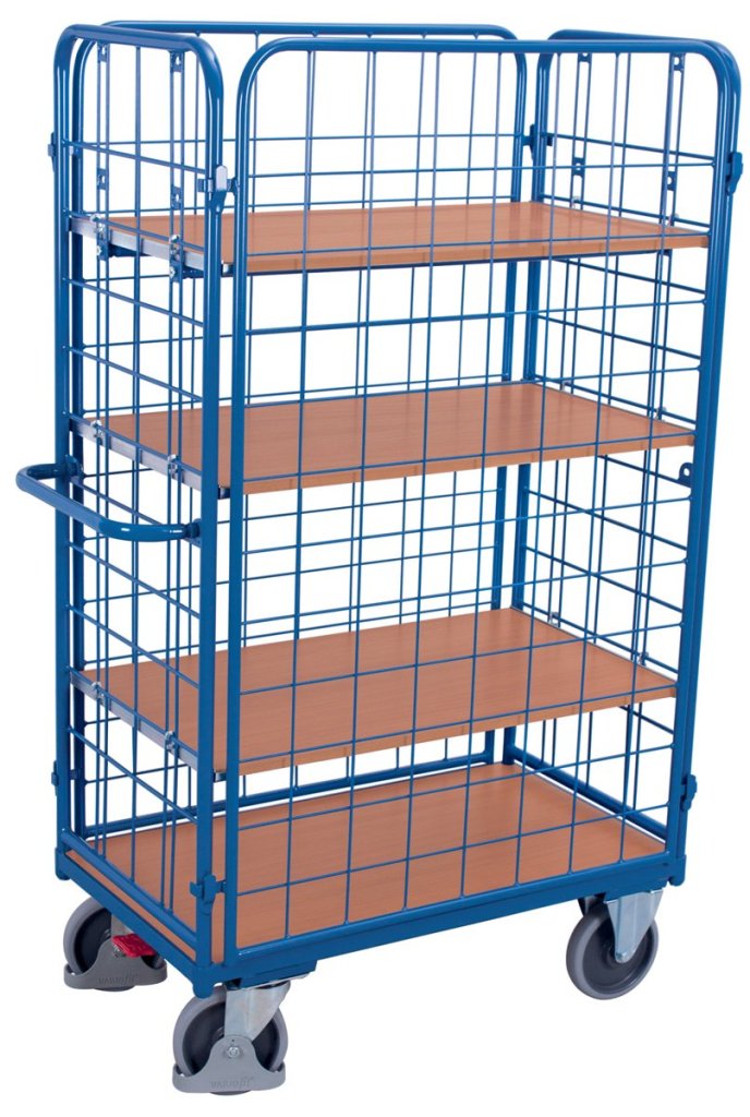 Shelf trolley made in Germany, steel structure, wire sides with mesh size 100 x 100 x 5 mm. Stable shelves made of hard wood-based material. A modular system that can be rebuilt or supplemented at any time. One shelf fixed and three removable, load capacity of one shelf 90 kg. 4 special Fetra TPE pneumatic wheels, of which 2 swivel with brake, 2 fixed.