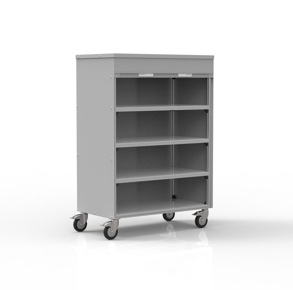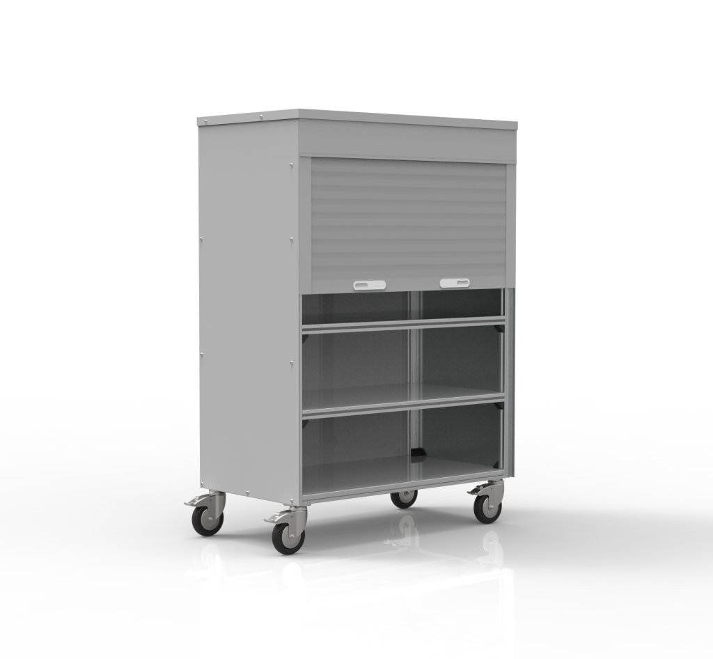 The shelving trolley with a roller shutter is made from aluminum profiles with stainless steel sheet cladding. The trolley full description and parameters