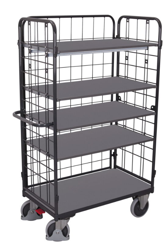 Shelf trolley made in Germany, steel structure, wire sides with mesh size 100 x 100 x 5 mm. Stable shelves made of hard wood-based material. A modular system that can be rebuilt or supplemented at any time. One shelf fixed and three removable, load capacity of one shelf 90 kg. 4 special Fetra TPE pneumatic wheels, of which 2 swivel with brake, 2 fixed.