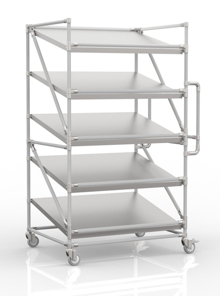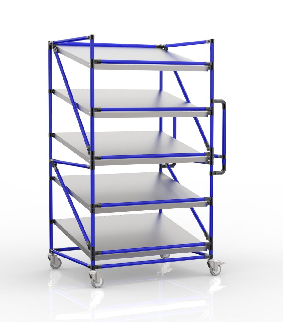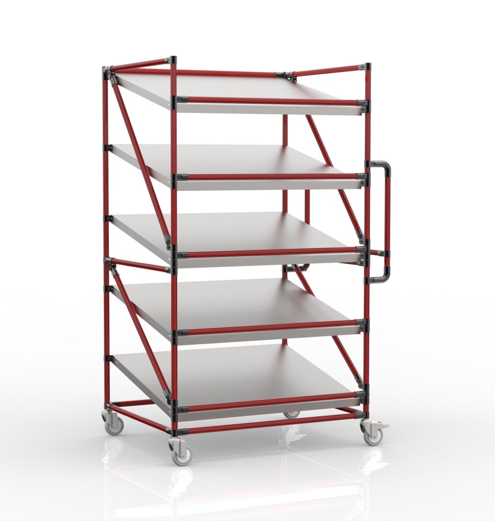 The crate trolley with five inclined shelves is a practical helper for handling in manufacturing companies and logistics centers.