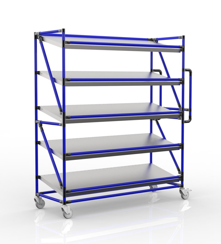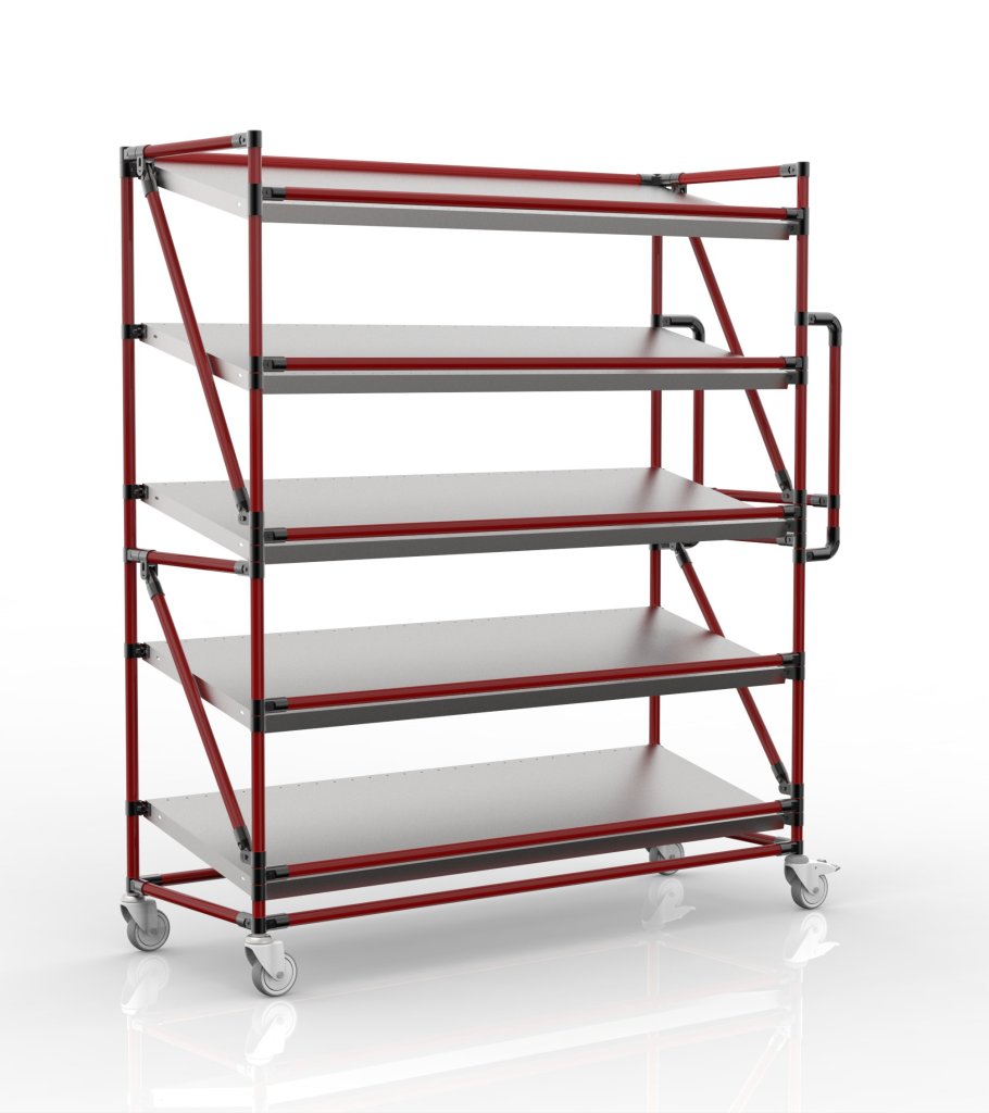 The crate trolley with five inclined shelves is a practical helper for handling in manufacturing companies and logistics centers, especially in the field of e-commerce.