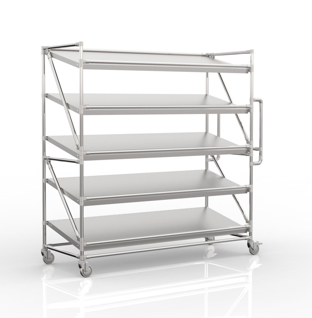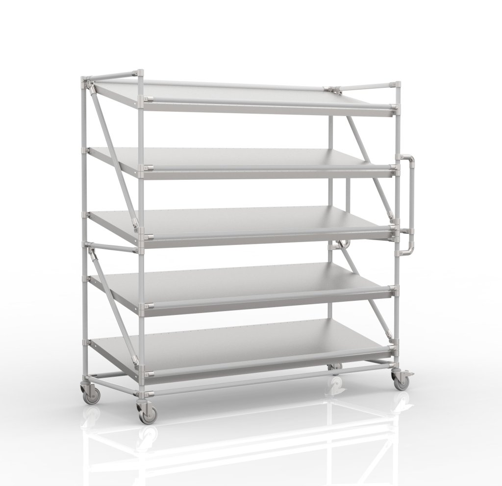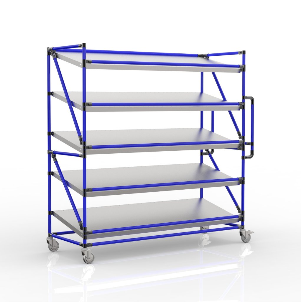 The crate trolley with five inclined shelves is a practical helper for handling in manufacturing companies and logistics centers, especially in the field of e-commerce.