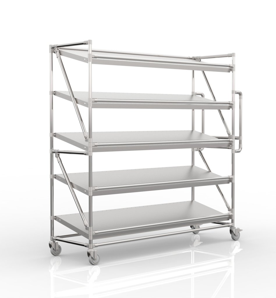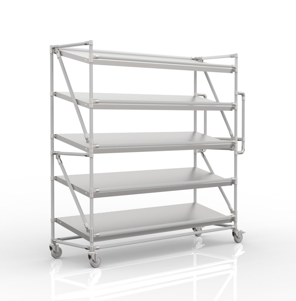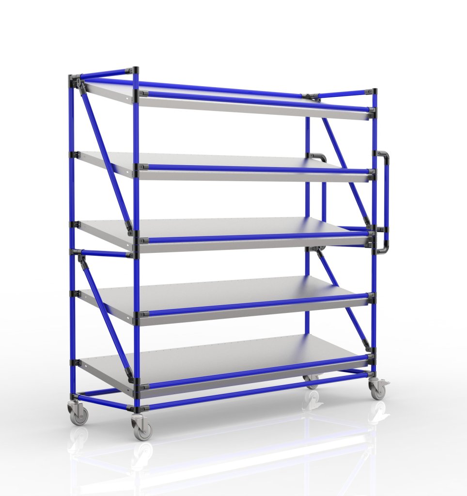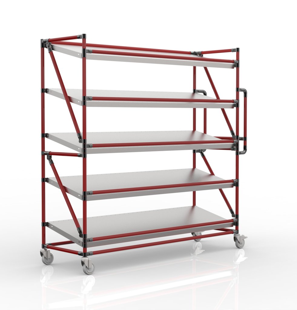 The crate trolley with five inclined shelves is a practical helper for handling in manufacturing companies and logistics centers, especially in the field of e-commerce.
