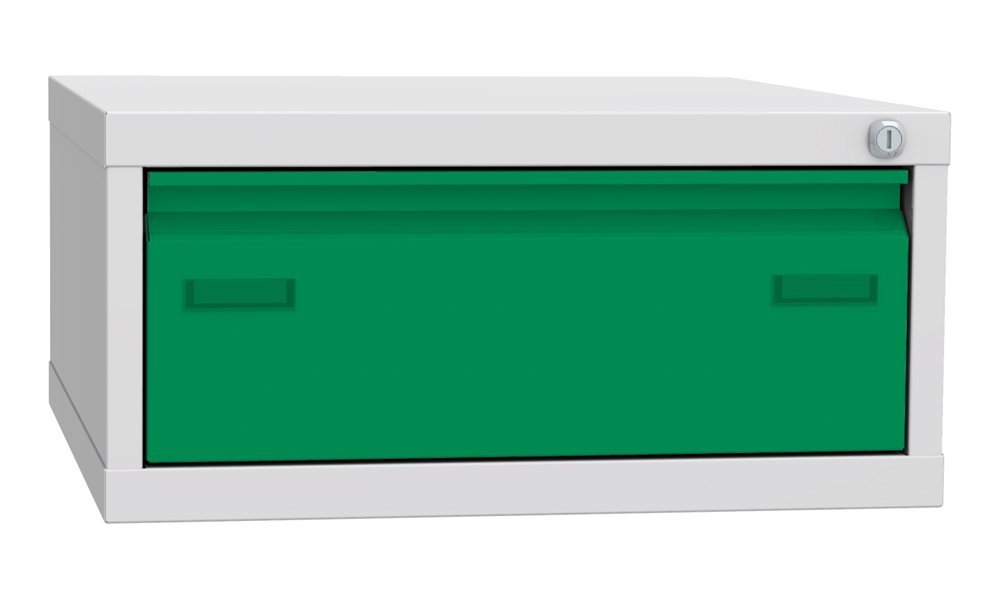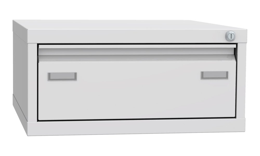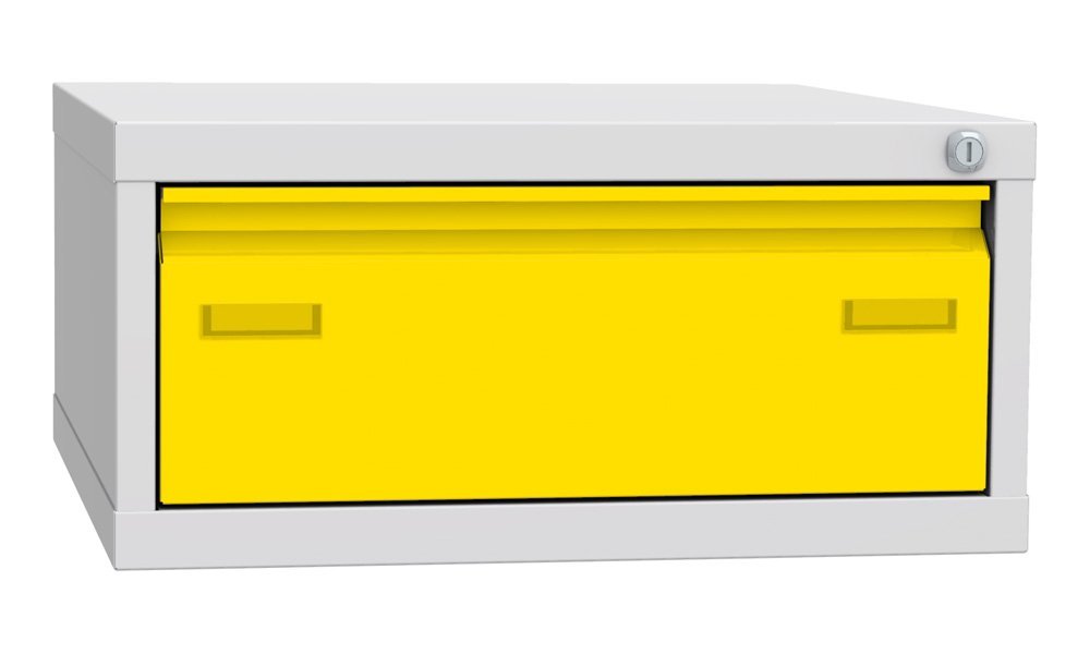 Cardboard for A5 formats, single drawer (there are 2 compartments in the drawer). Height 265 x width 560 x depth 600 mm. Metal body in light gray RAL 7035, drawer in different colors, cylinder lock.