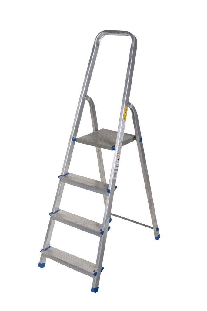 Price-friendly steps with stable steps (205 x 360 mm made of light metal) with safety handrail and storage tray. The ends of the supporting profiles are equipped with feet. Compact when folded. Number of steps 2, working height 2450 mm, lower outer width 550 mm, load capacity 150 kg, 10-year warranty.