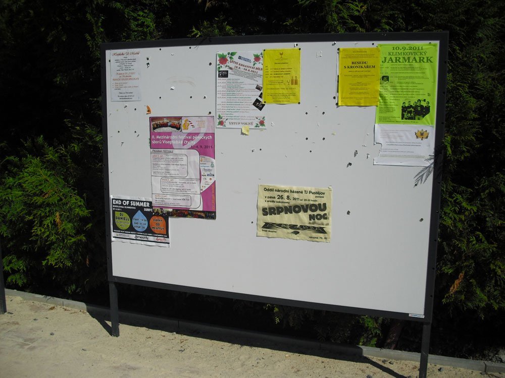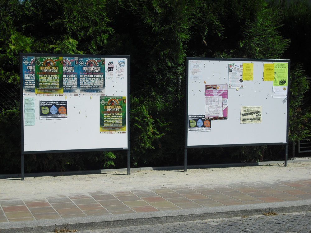 The sticker poster board consists of 2 surfaces, which form an anodized aluminum frame and a PVC board with a thickness of 8 mm. Columns are placed between the individual surfaces. Dimensions h. 1500 x w. 3000 mm. Price including silver anodized columns.