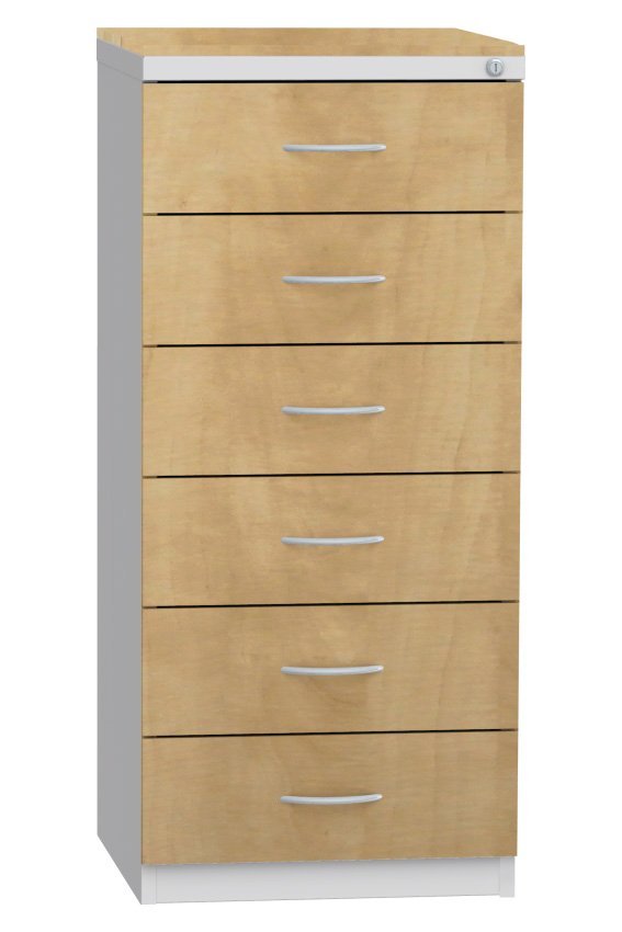 Postcard box for A5 formats with six drawers (there are 2 compartments in each drawer). Height 1250 x width 560 x depth 600 mm. Metal body in light gray RAL 7035, laminate drawers in beech, birch or cherry pattern. Central lock.