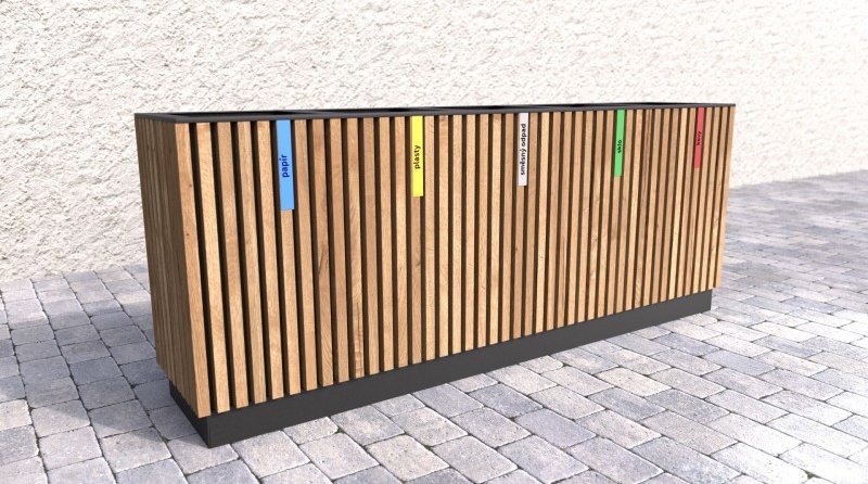 Outdoor waste bin for sorted waste with a wooden casing. The wooden slats are treated 3 times with a glaze that protects outdoor furniture from UV radiation and weather effects. The basket has removable galvanized inserts for waste with a volume of 65 l. Weight 106 kg.