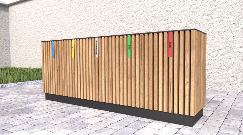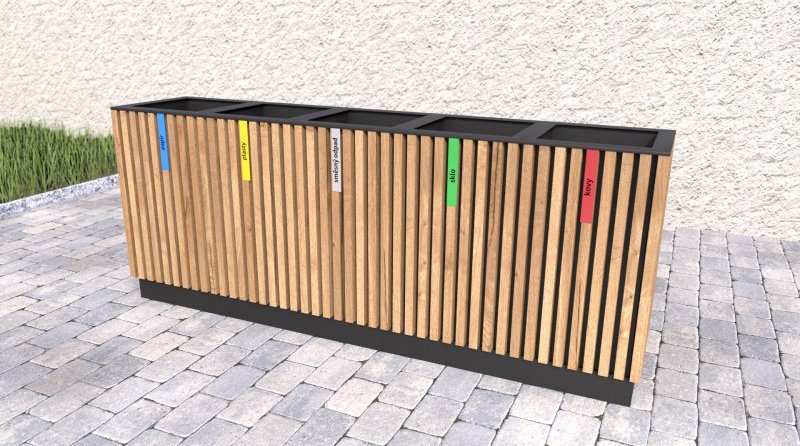 Outdoor waste bin for sorted waste with a wooden casing. The wooden slats are treated 3 times with a glaze that protects outdoor full description and parameters