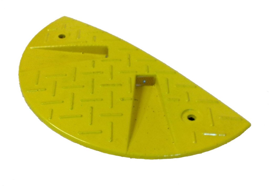Construction-traffic equipment to reduce undesirable vehicle speeds or to comply with permitted vehicle speeds on local roads. Use – roads, parking lots, entrances to buildings. Speed 20 km/h, color yellow. Made from a durable recycled compound. Highly visible at night. Height 50 x width 215 x depth 430 mm.