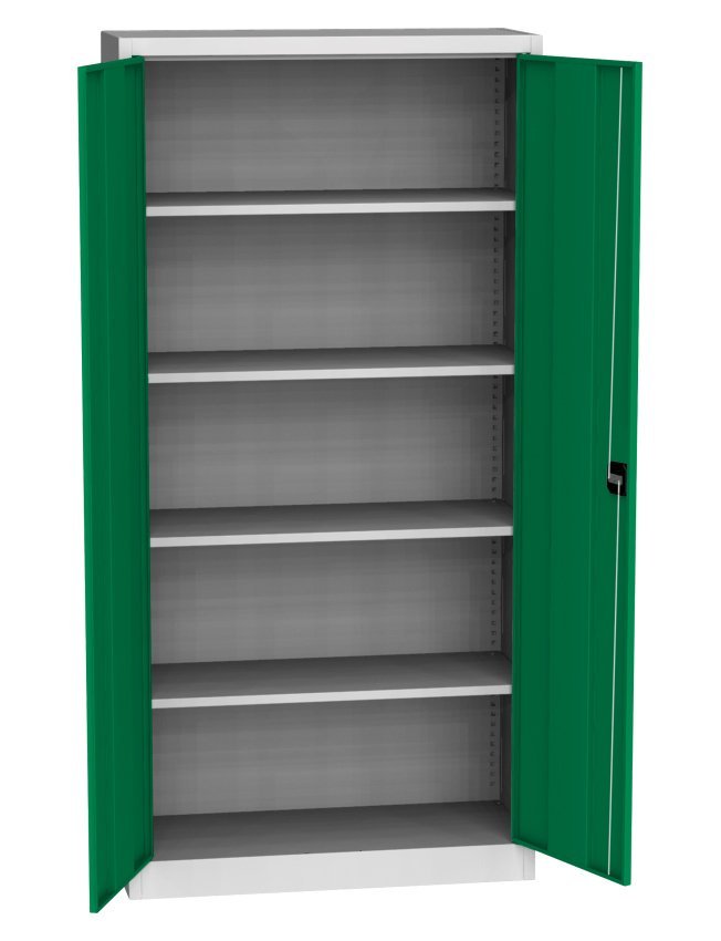 Two-door metal filing cabinet, 4 shelves, width 914, height 1950, depth 400 mm, various colors, lockable. In the color light gray RAL 7035 at a special price.