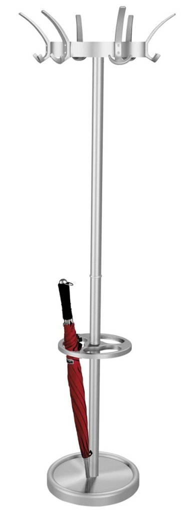 Stable metal base. The stand includes an umbrella holder and 6 hangers. Color silver. Dimensions in mm (H x W x D) 1680 x 510 x 460.
