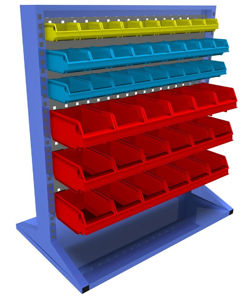 Stationary double-sided panel with equipment. The structure of the stand consists of a robust frame with metal perforated walls for hanging plastic boxes. The frame is painted with durable powder paint, the perforated panels are galvanized or painted with durable powder paint.