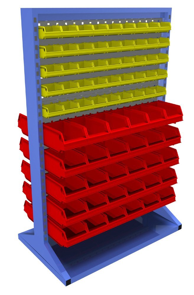 Stationary double-sided panels with equipment. The construction of the stand consists of a robust frame with metal perforated walls for hanging plastic boxes and tool holders. The frame is painted with durable powder paint, the perforated panels are galvanized or painted with durable powder paint.