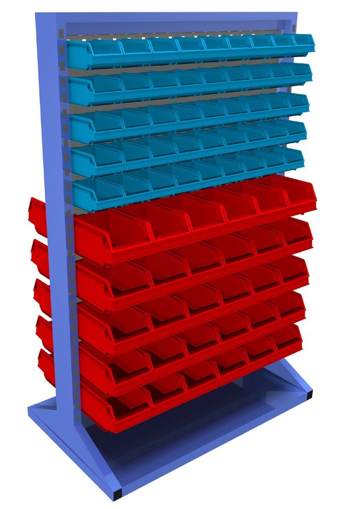 Stationary double-sided panel with equipment. The structure of the stand consists of a robust frame with metal perforated walls for hanging plastic boxes. The frame is painted with durable powder paint, the perforated panels are galvanized or painted with durable powder paint.