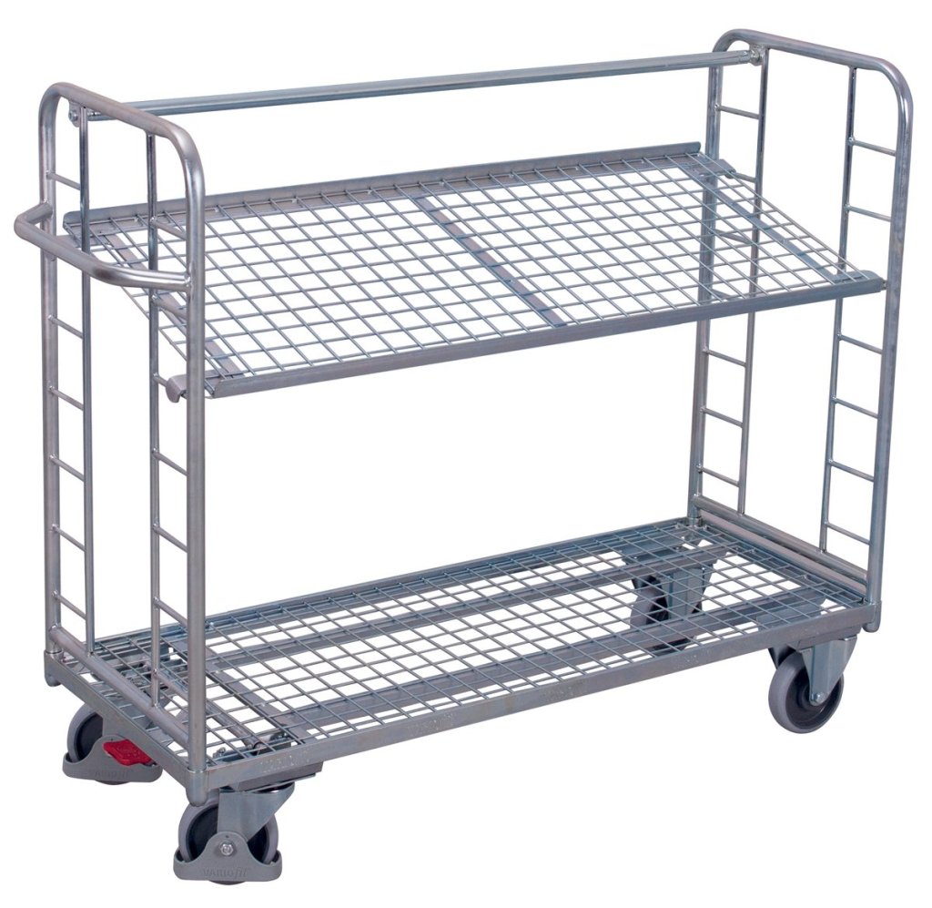 Storied trolley with sloping shelves. Welded steel construction, 2 shelves. Slope 15°. Zinc coating. Bed surfaces made of galvanized wire mesh 50 x 50 mm. Shelf capacity 50 kg. Highly durable thermoplastic castors with ball bearings (2 swivel with Easy Stop central brake and 2 fixed). Dimensions: height 1235 x width 1510 x depth 550 mm. Loading area 1355 x 550 mm.