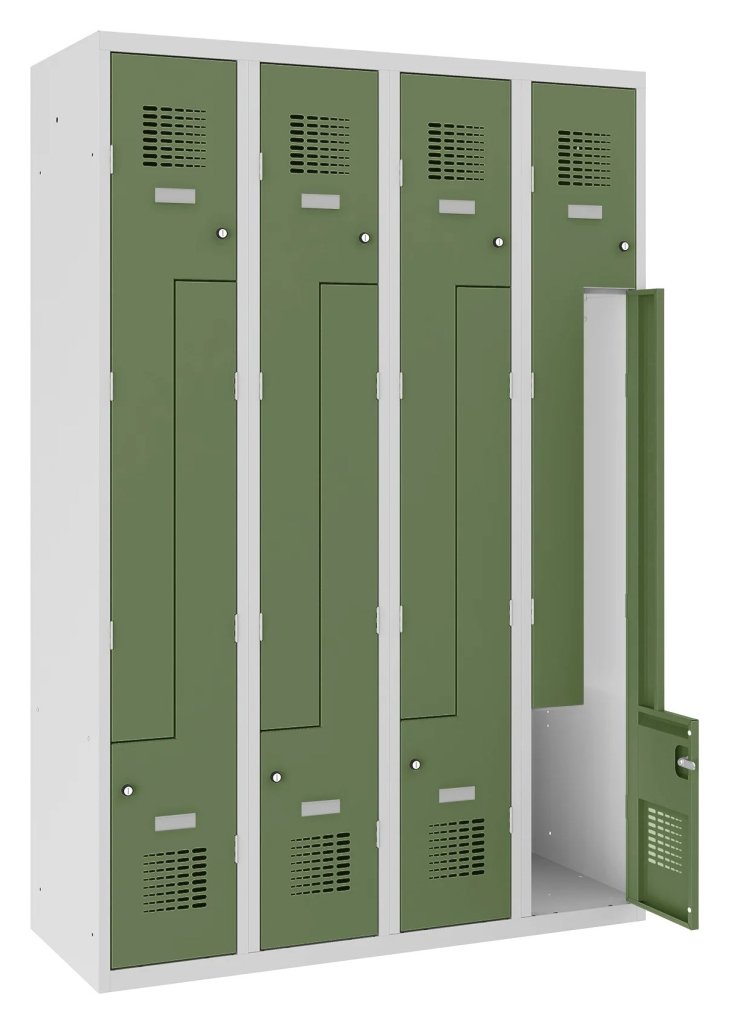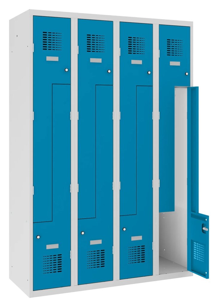 Four-door wardrobe with welded construction and modern ventilation system design. Ideal for small spaces. Height 1800 x width 600 x depth 500 mm. Standard locker equipment: bar with hooks, self-adhesive name tag. 16 color shades to choose from. Cylinder lock or padlock closure.