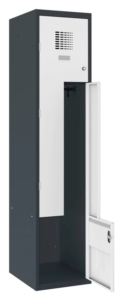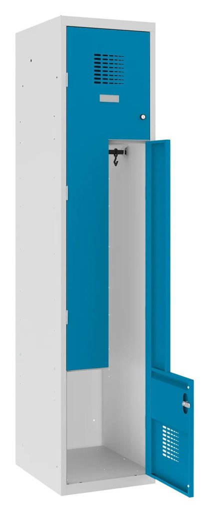 Two-door wardrobe with welded construction and modern ventilation system design. Ideal for small spaces. Height 1800 x width 300 x depth 500 mm. Standard locker equipment: bar with hooks, self-adhesive name tag. 16 color shades to choose from. Cylinder lock or padlock closure.