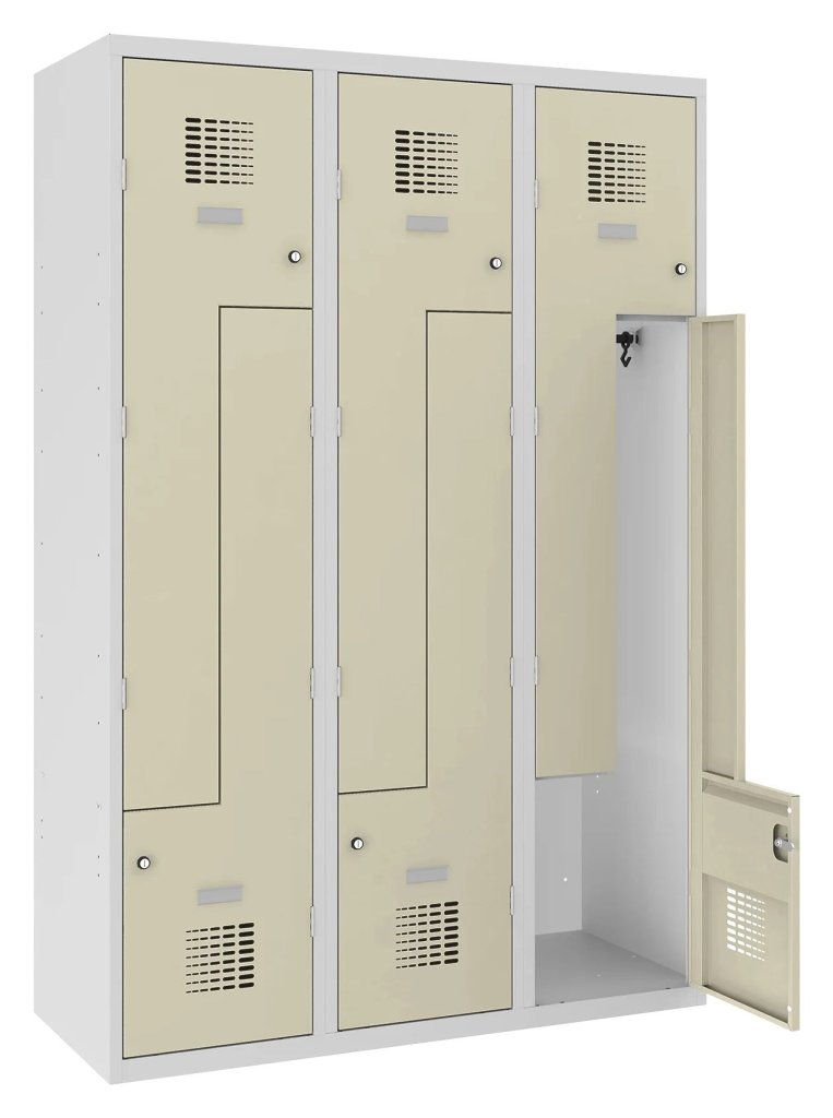 Six-door wardrobe with welded construction and modern ventilation system design. Ideal for small spaces. Height 1800 x width 1200 x depth 500 mm. Standard locker equipment: bar with hooks, self-adhesive name tag. 16 color shades to choose from. Cylinder lock or padlock closure.