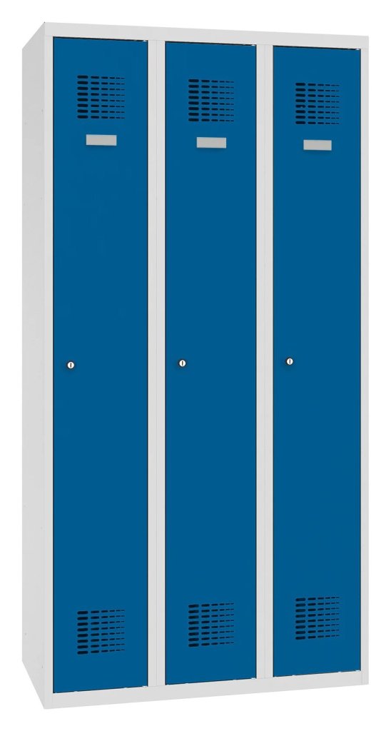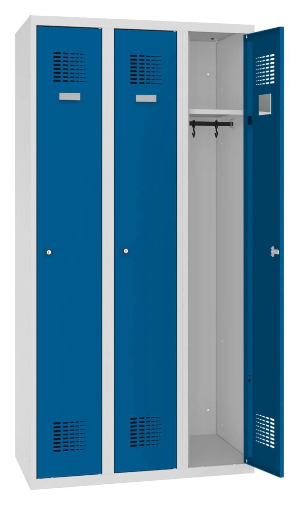 Three-door wardrobe with welded construction and modern ventilation system design. Height 1800 x width 900 x depth 500 mm. Standard cabinet equipment: rod with two hooks, towel hook, mirror, shelf above the rod, self-adhesive name tag. Cylinder lock or padlock closure.