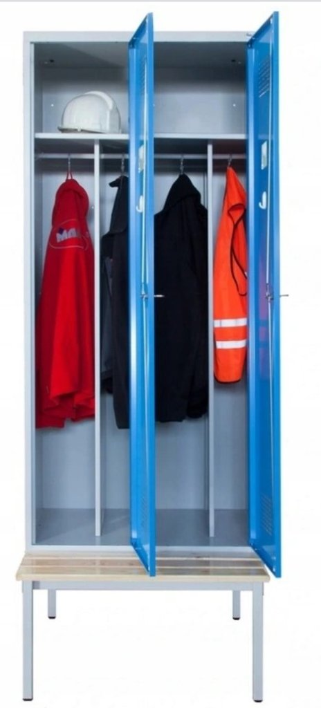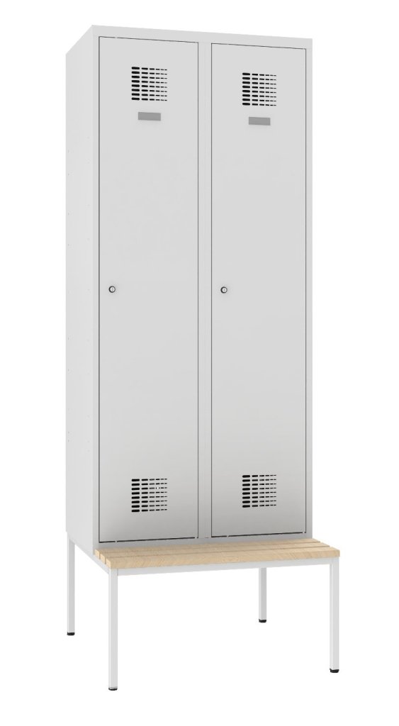 Two-door wardrobe with bench and modern ventilation system design. Height 2190 x width 800 x depth 500 mm. Standard cabinet equipment: internal partition for separating clean and dirty laundry, rod with two hooks, towel hook, mirror, shelf above the rod, self-adhesive name tag. Cylinder lock or padlock closure.