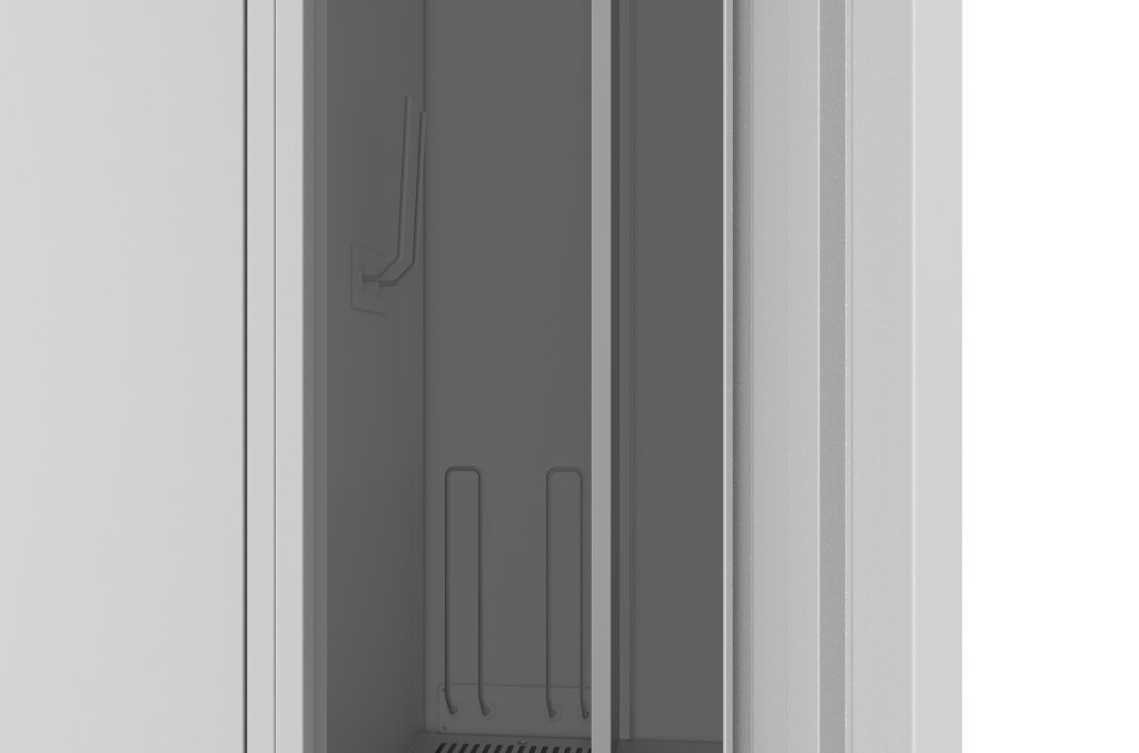 Two-door wardrobe with welded construction with heating and ventilation. Height 1940 x width 800 x depth 490 mm. Standard equipment of the cabinet: rod with two hooks, towel hook, mirror, shelf above the rod, shoe and glove holder, self-adhesive name tag. Cylinder lock.